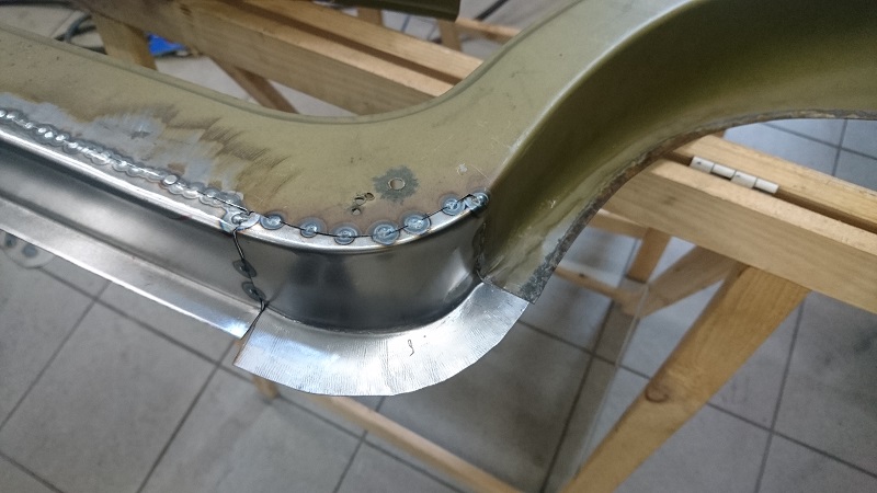 Weiter geht es mit der Türe hinten. Den überstehenden cm habe ich gefunden von der Türe, der Radlauf ist nach innen gezogen. Ziemlich ramponiertes Türblech. Dazu kommen noch die Luftlöcher was zu einem Neubau einlädt. DSC_5109.JPG DSC_5110.JPG Der Rohschnitt DSC_5111.JPG DSC_5112.JPG Der esrte Teil ...