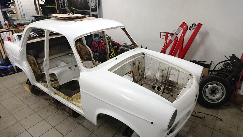 So.. die Karrosse ist demontiert. Türen wurden alle entfernt, Heckdeckel und Motorhaube ebenfalls von allen Kleinteilen befreit.